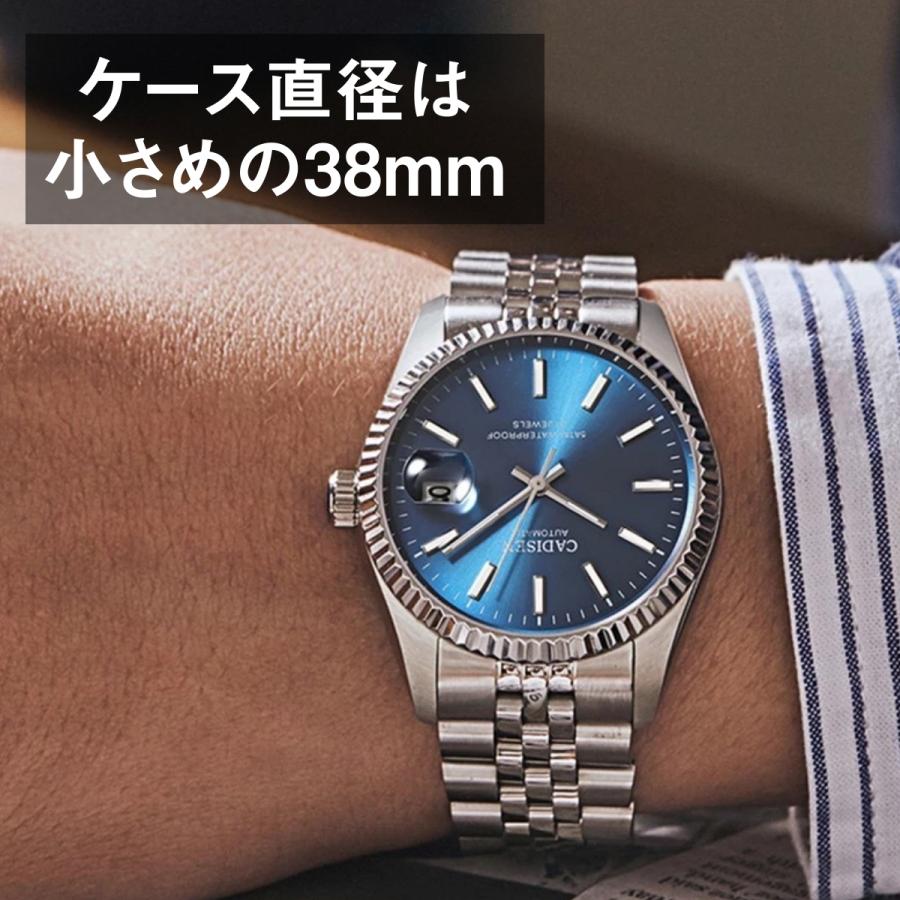 商品情報 ムーブメントは日本製のMIYOTA 8215を採用。 風防の材質は、高級腕時計に使用されるサファイアガラスを採用。傷が付きにくい等の特徴があります。 暗い所でも見える「夜行インデックス」採用。 防水性能は5気圧防水。 日付表示付きで、裏蓋はスケルトンになっています。 高級感の有るギフトボックスが付いていますので、プレゼントに最適。 ‐‐仕様‐- 型番:C8053 ケース材質:ステンレス ケース厚さ:12mm ケース直径:38mm ベゼル材質:ステンレス ムーブメント:自動巻き機械式(手巻き付き)MIYOTA 8215 風防材質:サファイアガラス バンド幅:20mm バンド長さ:210mm バンド材質:ステンレス バックル:プッシュ式両開き 耐水:5気圧防水(日常生活用強化防水時計) 重量:128g ‐‐付属品‐‐ ギフトボックス 取扱説明書(英語表記) 保証書(カード) タグ |