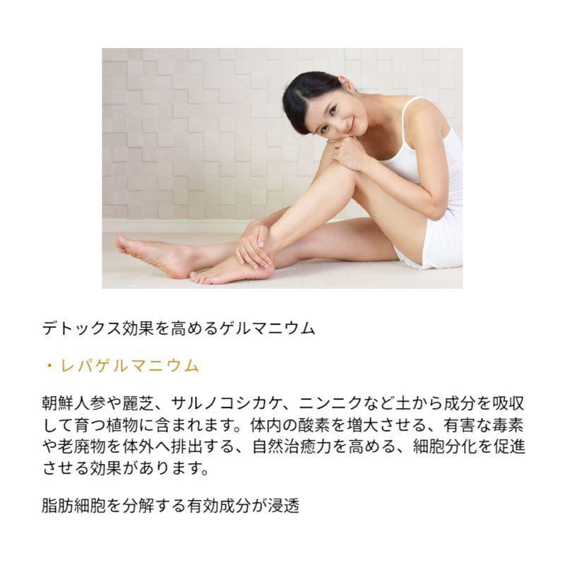 商品情報 有機ゲルマニウムの働きにより、イオン作用や発汗促進、肌質改善などが期待できます。 また、多量の金箔がはいっているので今までに体験したことのない驚異的な発汗効果が期待できます。 有機ゲルマニウムを溶け込めるだけ溶かした水溶性ジェルに、金箔と7種類の植物エキスを配合し、ゲルマニウム温浴の3倍以上(1,000ppm)の濃度が凝縮された、直接肌に塗って使用できるジェルです。 【ゲルマジェルを用いたゲルママッサージ】 ゲルマニウムは、皮膚からの浸透によって成分が全身を巡り、発汗の促進体内の余分な脂肪、有害な毒素、老廃物の排除を促します。 さらに血行を促進することにより、体内各臓器、器官の活性化・機能の正常化を助けます。 ゲルマニウムがたっぷり溶け込んだ“ゲルマジェル”を直接肌に塗布しマッサージを行います。 関連キーワード ハイパースリムジェル 金箔 有機ゲルマニウム 発汗作用 ダイエット 美肌効果 ラジオ波 ボディマッサージ 抗酸化作用 血行促進 |