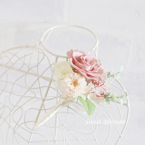 プリザーブドフラワーのブーケ・ブートニアの2点セットをオーダーメイドで承っております。 写真はオーダーメードでご注文いただいた作品の一例でアンティークピンクのプリザーブドローズを中心にクリーム色のミニダリアやグリーン小花、グリーンなどをあわせたブーケです。 メインのお花をプリザーブドフラワー、グリーンや小花はブーケに合うドライフラワーや質の高いアーティフィシャルフラワー(造花)を使用しています。 プリザーブドフラワーのナチュラルブーケ・ブートニアの2点セットは18000円~承ります。 持ち手部分をクラッチブーケ風(茎を束ねたタイプ)にすることも可能です(追加料金1000円) お花のお色や雰囲気などご希望のイメージとご予算をお打ち合わせ内容で制作させていただきます。 また掲載写真と同じブーケのご希望も承りますのでご注文前にお問い合わせください。(但し作品に使用している花材が廃盤やリニューアル等により花材は代替品を使用することがございます。) まずは「質問・オーダーの相談をする」からお気軽にご相談連絡をください。 ご希望イメージとご予算などオーダー内容にOKいただけましたら別途オーダーページをご案内させていただきます。 ご注文後は、花材の色合わせからブーケ等の完成までお写真のやり取りで確認していただきながら制作を進めていきます。 (ブーケサイズ)直径 約25~27cm ※それ以上のご希望の場合もご予算に合わせてご提案させていただきます。 (ブートニア)ブーケと同様の花材を使って制作します。 ※お揃いのヘッドパーツもご希望の場合はお問い合わせください。 ☆★☆*…*…*…*…*…*…*…*…*…*…*…*…*…*…*…*★☆★ 素材:プリザーブドフラワー、ドライフラワー・アーティフィシャルフラワー 受注後制作いたします。 お届け日については事前のお打ち合わせで取り決めさせていただきます。 通常は発送まで約3週間(21日)程度お時間をいただいおります。 お急ぎの場合など納期のご希望ある場合はご購入時に備考欄にご記入お願いします。 *********** ウエディングブーケ * ウエディング * ブーケ * ナチュラルブーケ * 造花 * ラウンドブーケ * アーティフィシャルフラワー * プリザーブドフラワー * 結婚式 * ブライダル