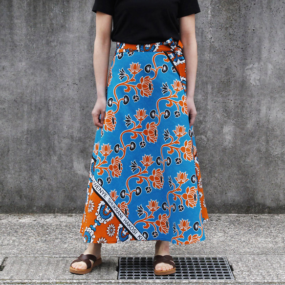 さっと巻くだけで、華やかな印象に! 存在感あるカンガのラップスカート ♦ フォルムの美しさ、柄を活かしたデザイン 最大の特長は、スカートフォルムの美しさと柄の配置です。 同じ柄のカンガ2枚を使って作った扇型の綺麗なラインが、ウエストから裾にかけてたっぷり広がっています。文字とフレーム柄は、裾の斜め後ろから前に向かって流れて来るように仕立ています。 ♦ さっと巻くだけ、楽な着心地 ウエストを紐で結ぶタイプなので、膨らむことなく見た目もスッキリ。調節も簡単です。 水通しをしたカンガから縫製しているので、最初からナチュラルな風合いを楽しんでいただけます。 アフリカらしい色合わせなのに、不思議と落ち着いた印象を与えてくれるカンガの色と柄。 トップスはTシャツやブラウス、シンプルなものと合わせていただくのがオススメ。素足にサンダルも素敵です。 コーディネートの主役となってくれるアイテムです♪