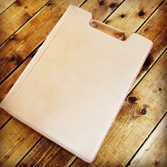 国内最高峰の皮革タンナーの栃木レザー社製のヌメ革を贅沢に両面貼り合わせた、A4サイズ用紙が収まるクリップ