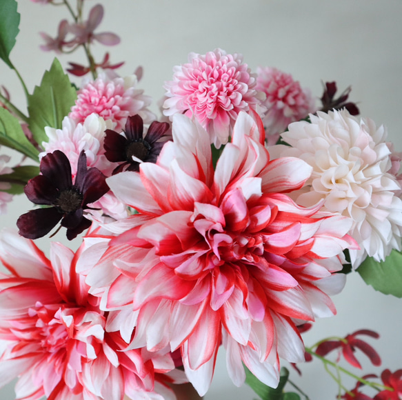 トレンドの洋マム&ダリアや雰囲気のあるチョコレートコスモスなどの人気花材を動きを出して流れるようなデ