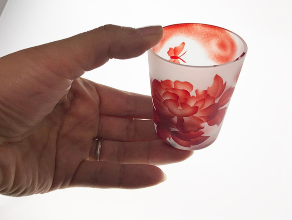 【スクエア木箱入り】 ★単品ご購入よりお得なセットになります。 受注制作のため、お時間いただく旨ご了承ください。 江戸硝子(made in Tokyo 東京都伝統工芸品指定)の手作りおちょこを用いて、人気のいのしかちょう:「蝶に牡丹」「萩にいのしし」「紅葉に鹿」の花札模様セットでお送りします。 ボタンの花びらは、一枚一枚丁寧に彫り重ねた特殊な技法で制作しています。 鹿やいのしし、草木のひとつひとつにぼかしをいれて柔らかな立体感を出して仕上げています。色味をすべて落とさず、ごくわずかに残してグラデーションを表現しているのが特徴です。 上からながめても楽しんでいただけるように底にも模様をほりこんでいます。 高度なサンドブラスト技法による工芸グラスをお楽しみください。 ※手作り品のため、モチーフが同じでも色味の濃さや模様の配置、彫り込み具合削り具合などが多少異なることをご了承の上お買い求めください。 ※素材自体も手作りのため、多少の色むらやスジ、泡などがある場合がございますが予めご了承ください。 ・・・・・・・・・・ 【製法について】 こちらの作品には「被せ硝子」という制作の難しい特殊なガラスをつかっています。 「切子」に使われているものと同じ素材です。 外に「色ガラス」と内側に「透明ガラス」の二層のガラスを薄く型にいれて吹きあげて制作されています。 (特に、江戸時代より続く伝統工法に則り、今なお都内で制作を行っていると認定された窯元のガラスは「江戸硝子」と呼ばれ大変人気があり、 こちらの作品はその江戸硝子を使用して製作したものです。) ペイントや印刷のものと違い、表層の色ガラスをサンドブラストで削って模様を表現したものです。 ガラスそのものの色味なので、色あせたり、剥げて消えたりする事なく安心して永くお楽しみいただけるのが特徴です。 すりガラスのマットな質感、ぼかしを多用し、細かく丁寧に彫りだしたワザありのサンドブラストをお手元でお楽しみください。 磨きは薬品を使わずに手磨きで1つ1つ丁寧に仕上げています。 ・贈り物の場合は、男性向け、女性向け、誕生日用、結婚祝い、敬老の日用など、 ご用途をメッセージをご記入ください。 |