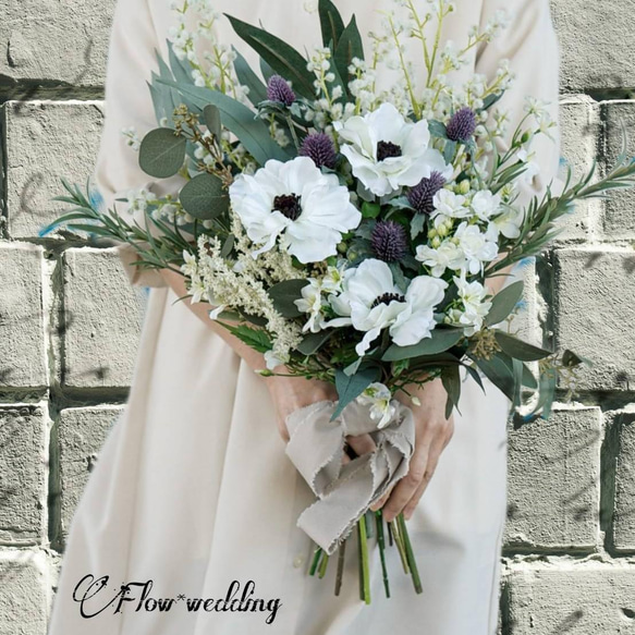 これまで数多くのウェディングを手掛けてきたデザイナー厳選のブーケ。 経験豊富なフラワーデザイナーが、あなたのために季節にとらわれないアーティフィシャルフラワーでお作り致します。 *-*-*-* 商品について -*-*-* ■アーティシャルフラワーで出来た、白を基調としたクラッチブーケです。 コチラはブーケのイメージに合わせたブートニアもセットでの販売となります。 またヘアーパーツ(髪飾り)は別売りとなりますので、ご希望の方はオプションより追加購入をご検討くださいませ。 ブーケサイズ (高さ約55センチ×幅約40センチ) 画像はイメージです。 本商品はFlowのデザイナーが一つ一つご注文を頂いてからお作りします。 純白の花に淡い紫がアクセントな、 エレガントなブーケに仕上げています。 春の花アネモネと、白を中心とした花を使用し、 ニュアンスカラーの柔らかな風合いのエアリーなリボンも、アクセントとなりどんなドレス姿も、柔らかで優しい雰囲気にしてくれます。 柔らかで清楚なイメージはナチュラルなウェディングを目指す方におすすめのブーケです。 1点ものとして制作しているため、同じものがどこにもない一点ものあなただけのブーケです。 結婚式や披露宴はもちろんの事、フォトウェディングや前撮り、 海外のリゾートウェディングでも枯れずに綺麗な状態を保つので、 安心してお持ちいただけます。 *お届けまでの期間 ご注文を頂いてからお届けするまで、7日ほど頂戴しております。 *取り扱いについて こちらは造花のため、お手入れ不要で長くお楽しみいただけますが、強い力を加えるとブーケの形が崩れたり花びらや葉が落ちる場合もございますのでお取り扱いにご注意ください。