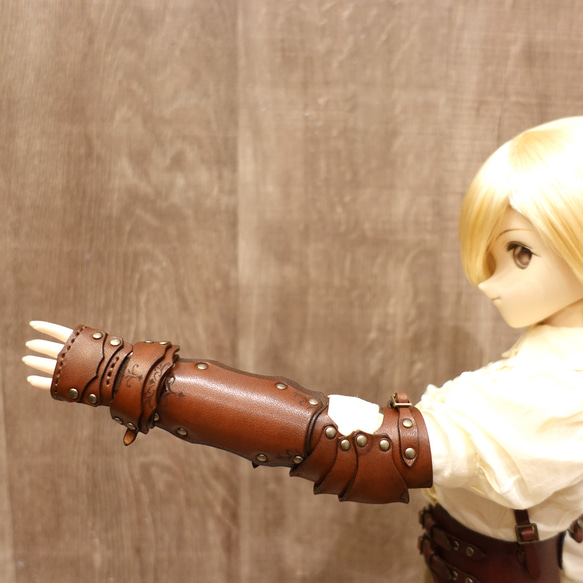 ※こちらは受注生産品となっております、ご注文頂いてから作成させていただきますので発送までおおよそ14日前後頂くことになりますがご容赦ください 良質の牛ヌメ、タンニンなめし栃木レザーを使用 汚し加工入り 完全ハンドメイド・手染め、手縫いで仕上げたファンタジーやスチームパンクテイストのバンブレース(腕鎧)とガントレットのセットです。 内容物 バンブレース(腕鎧)1点 ガントレット1点 右腕、左腕どちらかのみとなります 購入オプションより左右をお選びください 素材等 素材等 国産栃木レザー使用、ハンドメイド商品 カラー:焦げ茶 金具:アンティックゴールド 対象ドール:DD、DDdyドール ・長さ約130mm太さ約30mm ※1つ1つ手作業で制作しており、染め、汚し加工の風合いが写真と異なる場合があります ※1mmの革を染料にて染めている関係上、裏面まで染料が染み出している事がございますが表面の発色のクオリティを維持するために起こる事象で汚れではなく仕様となっております。 ※天然皮革製品は素材の特性上、色のムラ・キズなどがある場合があります。こういった素材の特性上のムラ・キズは不良品扱いとなりません。天然皮革製品の味といえる部分ですので、予めご了承の上、ご注文ください。また、素材の特性上のムラ・キズによる返品はお客様都合となります。 【検索用】牛革 本革 栃木レザー ヌメ革 メイドインジャパン 日本製 手作り ハンドメイド オリジナルデザイン ドルフィードリーム DD ドール用小物 ドール用服 ドール用アクセサリー ガントレット 革鎧 レザーアーマー レディース ファンタジー スチームパンク おしゃれ かわいい かっこいい 高級 |