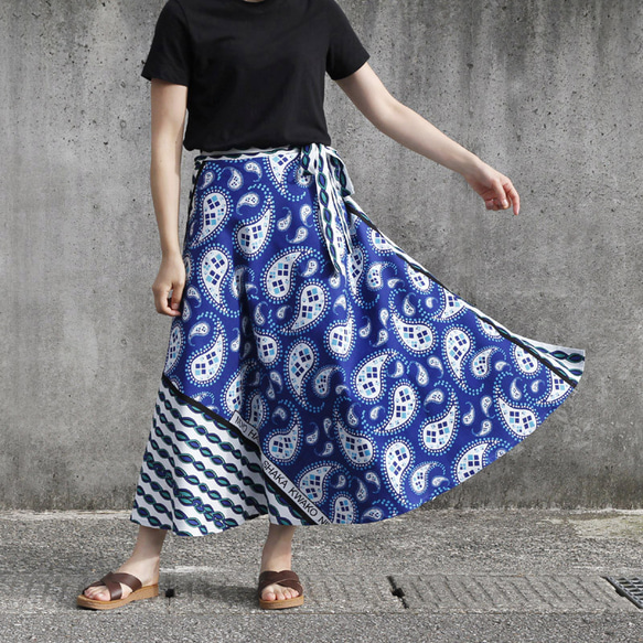 さっと巻くだけで、華やかな印象に! 存在感あるカンガのラップスカート ♦ フォルムの美しさ、柄を活かしたデザイン 最大の特長は、スカートフォルムの美しさと柄の配置です。 同じ柄のカンガ2枚を使って作った扇型の綺麗なラインが、ウエストから裾にかけてたっぷり広がっています。文字とフレーム柄は、裾の斜め後ろから前に向かって流れて来るように仕立ています。 ♦ さっと巻くだけ、楽な着心地 ウエストを紐で結ぶタイプなので、膨らむことなく見た目もスッキリ。調節も簡単です。 水通しをしたカンガから縫製しているので、最初からナチュラルな風合いを楽しんでいただけます。 アフリカらしい色合わせなのに、不思議と落ち着いた印象を与えてくれるカンガの色と柄。 トップスはTシャツやブラウス、シンプルなものと合わせていただくのがオススメ。素足にサンダルも素敵です。 コーディネートの主役となってくれるアイテムです♪