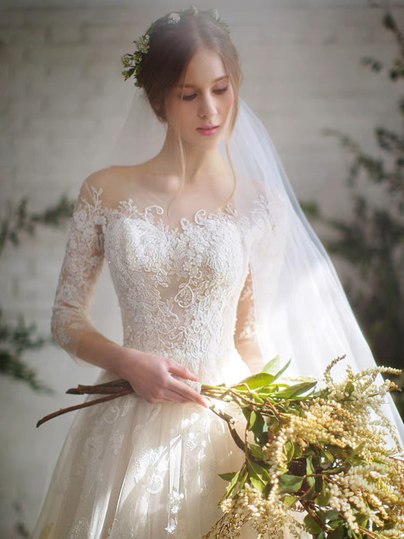 ウエディングドレス 七分袖 オフショルダー Aライン 二次会ドレス 白 前撮り 花嫁 ウエディング(WD242018)