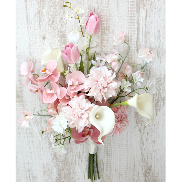 受注制作となりますので、下記をご一読後、ページ内『質問・オーダーの相談』よりご連絡ください。 結婚式や前撮り、フォトウェデイング等をご予定の花嫁様に、いつまでもその華やかな思い出を飾っていただけるように壁に飾れるクラッチ風ブーケ(スワッグブーケ)をご用意致しました。 ご自宅でのインテリアとして壁やドアに飾って頂けますと嬉しく思います。 高品質のアーティフィシャルフラワー(造花)を使った当店オリジナルのウェディングブーケになります。 茎をクラッチ風に仕上げております。 ブートニアをお付けします。 ピンクと白の色合いふんわりと優しい雰囲気のクラッチブーケになります。 ピンクのダリアやコチョウラン、チューリップ、白のカラー等で高低差をつけて動きのあるブーケに仕上げております。 持ち手はオフホワイトのサテンを結んでおります。 お色違いでご希望がございましたらお知らせください。 ブーケのサイズ 最大横幅34㎝ 高さ約45㎝ 造花(アートフラワー/アーティフィシャルフラワー)はドライフラワーやプリザーブドフラワーと異なり、湿気や防虫対策等必要がございませんので、ご使用後も色褪せることも枯れることもなく手間がかからずいつまでもお手元に飾っておけます。 ◇ご注文確定後(お支払後)の制作となりますが、在庫状況により一部花材の変更も考えられます。 その場合は、変更花材を画像にて確認して頂いた後、ご注文をお受けしますのでご安心ください。 ◇上記の件より、ご注文前に、まず、ページ内『質問・オーダーの相談』よりご連絡ください。 24時間以内にお返事致します。 また、こちらのブーケに関しまして、ご質問等がございましたら、お気軽にお問い合わせくださいませ。 ピンクと白のスワッグブーケ/リゾートブーケ/造花のブーケ/アーティフィシャルフラワーのブーケ/フォトウェディング/リゾートウェデイング/海外ウェディング/ロケーションフォト/前撮り/後撮り/トレンド/ /ぴょんぴょんブーケ/ピンクのクラッチブーケ/ピンクと白のブーケ/優しい色合いのブーケ |