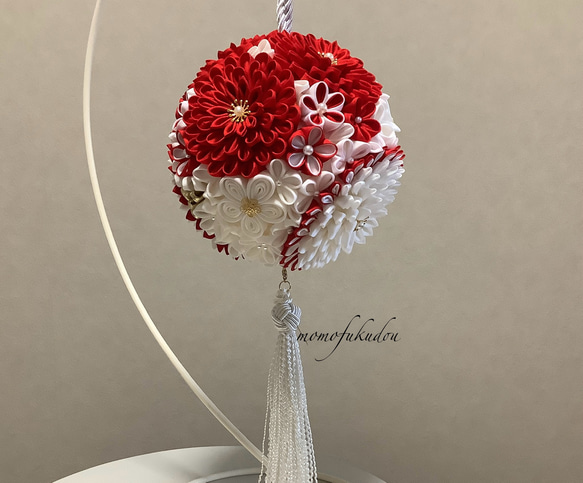 つまみ細工のボールブーケです。 沢山の花をボール状にし、見る方向によって色々な表情を楽しむことができます。 4枚目の画像はイメージです。 タッセルは3種類からお選びください。 白タッセル(7枚目画像)、白リボン(8枚目画像)、赤リボン(4枚目画像)でご確認下さい。 素材は正絹です。 花のサイズは約15㎝です。 こちらのお品は送料のみ着払いとなります。 つまみ細工は水分に弱い為保管にはご注意下さい。 ハンドメイドである事をご理解お願いします。 |