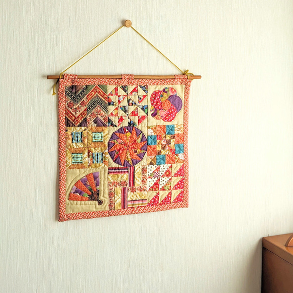 千代紙で折ったようなパターンを並べたサンプラーキルト。 サイズは37.5cm×37.5cm 全て手縫いの和風パッチワークキルトのミニタペストリーです。 可愛らしい着物柄のようなプリント生地をピースカットして、 1枚1枚丁寧に縫いつなぎ、キルト芯を挟んで手縫いでキルティングしてあります。 レトロ感のある色合いですが、金色のプリントやキルティング糸を使ってるので、角度によってはキラッ☆としますよ(*^^*) ミニサイズなので小さなスペースに飾れますので、ケースに入ったおひな様の近くに飾って頂いても素敵♪だと思います 9枚目のピックは棒通しです。 ご自分でお好きな感じに縫い付けて下さいね♪ ✽✽✽✽✽✽✽✽✽✽✽ D-twins*のキルト作品は デザインから製図、 布選び、布をカット、 そしてピーシング、キルティング。 最後にパイピングと 長い長い時間をかけて作る、昔ながらの手縫いで制作しています。 キルトを手にされた方に幸せが訪れますようにと、真心込めて縫いました(*^^*)