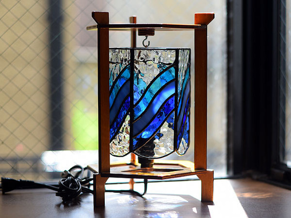 サイズ W 170mm × H 264mm ソケットE17タイプ 電球 25w白熱球クリアー 手作りの木枠に、水と風をイメージした青系ガラスで組んだ 6面ランプを吊り下げました スイッチは一般的なロータリー式です 木枠に「工房猫」の焼き印を入れ、新うるしで仕上げました。