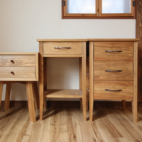 閲覧いただきありがとございます。ナイトテーブルやサイドチェストなどで利用できるハンドメイド家具です。天然木を使用しているため