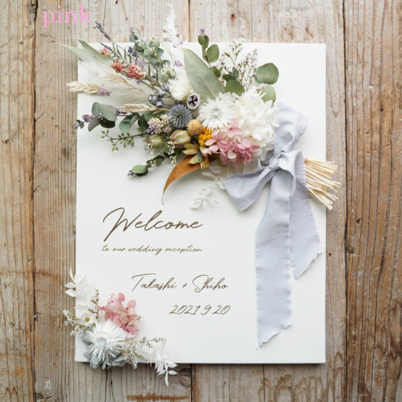 A3キャンバス・リボンブーケ ピンク 受注制作:ご入金確認後10日以内に発送手続きいたします。※納期ご相談承ります。 【オリジナル印字ができます※備考欄へご記入下さい】(2枚目写真参照:印字例) Welcome / to our wedding reception/ Haru+Aki/2024.9.20 ※改行部分に/を入れてください。文字のバランスはお任せください。(フォントの変更は出来ません) 結婚祝い・ウェルカムボード・開店祝い等のプレゼントに最適です。 花材 アジサイ・ライスフラワー・ユーカリ(プリザーブドフラワー) タタリカ・千日紅・フラワー・ラクスパー・ミニデージー・葉物(ドライフラワー) ※入荷・季節により花材の変更がある場合がございます、ご了承ください。 size 約A3 (F6キャンバス 410mm×318mm) (当店の商品はドライフラワーとアンティークカラーのプリザーブドフラワーを組み合わせて制作しております。) 配送size100 |