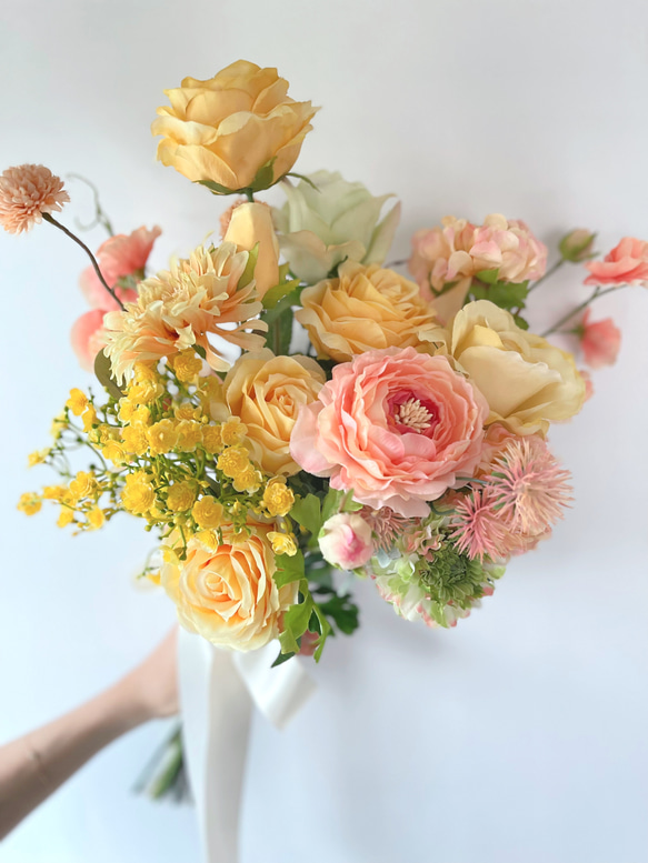 イエローベース・サーモンピンクのアーティシャルフラワークラッチブーケです。 バラを中心とし、小さなお花を散りばめた動きのあるゴージャスな印象のブーケです☺️ ブーケと同じお花を使用したブートニアとヘッドピースもぜひご利用ください 統一感が出てとても素敵です✨ 違う色合いで同じ雰囲気のブーケをご希望の方もご相談いただければ作成いたします。 リボンの色の変更なども可能ですので、お気軽にご相談ください ウェディングブーケ&ブートニア&髪飾り 生花と間違うほどのクオリティーで、半永久的に美しさを保てるお花を使用しております。 生花のオーダーブーケに比べてお値段もお得です。 ★お式の後も記念にインテリアブーケとして飾っていただけます。またウェディングブーケとしてだけでなく記念のプレゼントブーケとしてもご利用いただけます。 ★海外挙式、リゾート挙式など、旅を伴う挙式にも最適です。 ★結婚写真の前撮り、挙式、パーティなど、何度でもご利用いただけます。 ★ アーティフィシャルフラワーの特徴 生花と間違うほどのクオリティーで、半永久的に美しさを保てるお花です。主にポリエステルやポリエチレンといった素材で作られており、耐久性に優れています。また、人工的な花のため、劣化しません。生花と比べ、長期間利用することが可能な為、近年はウェディングシーンで生花より扱いやすい事から多く用いられています。また、水などが必要ない為、メンテナンス性に優れておりディスプレイやインテリアにも最適です。 ★お手入れについて 生花と違い基本的には手入れは不要です。長期間飾っている場合はホコリなどをふき取って下さい。 ※※※ご注文に関する注意点※※※ ・メーカー在庫によっては多少違う花材が入ることがありますが、ボリュームは同じ様にお作りしますのでご了承ください。 ・オーダーメイドは、ご注文いただいてから、お客様の為だけにお作りする品です。 ・一点物で他のお客様に販売できませんのでご注文後のキャンセルは一切お受けできません。 ・特別な理由でキャンセルをお受けする場合は商品の特性上、納品前であってもデザイン制作開始後はキャンセル料として総額の70%がかかりますことをご了承ください。 |